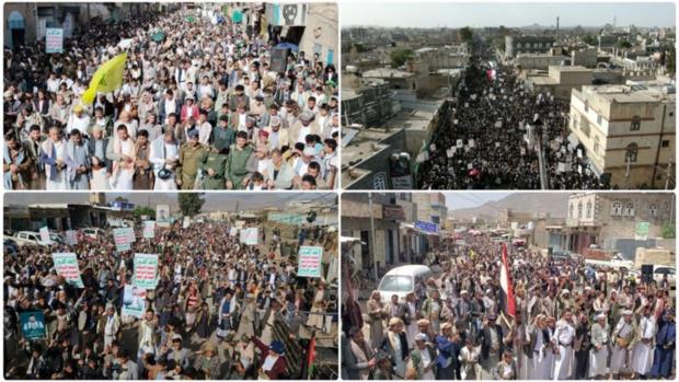 احتشد أبناء محافظة عمران اليوم الجمعة، في مسيرات حاشدة في 130 ساحة بعاصمة المحافظة ومختلف المديريات، تحت شعار " "محور واحد صف واحد في مواجهة الطغيان الأمريكي الإسرائيلي"، تأكيدا على موقف الشعب اليمني الجهادي في مواجهة المخطط الصهيوني الذي يستهدف الأمة.